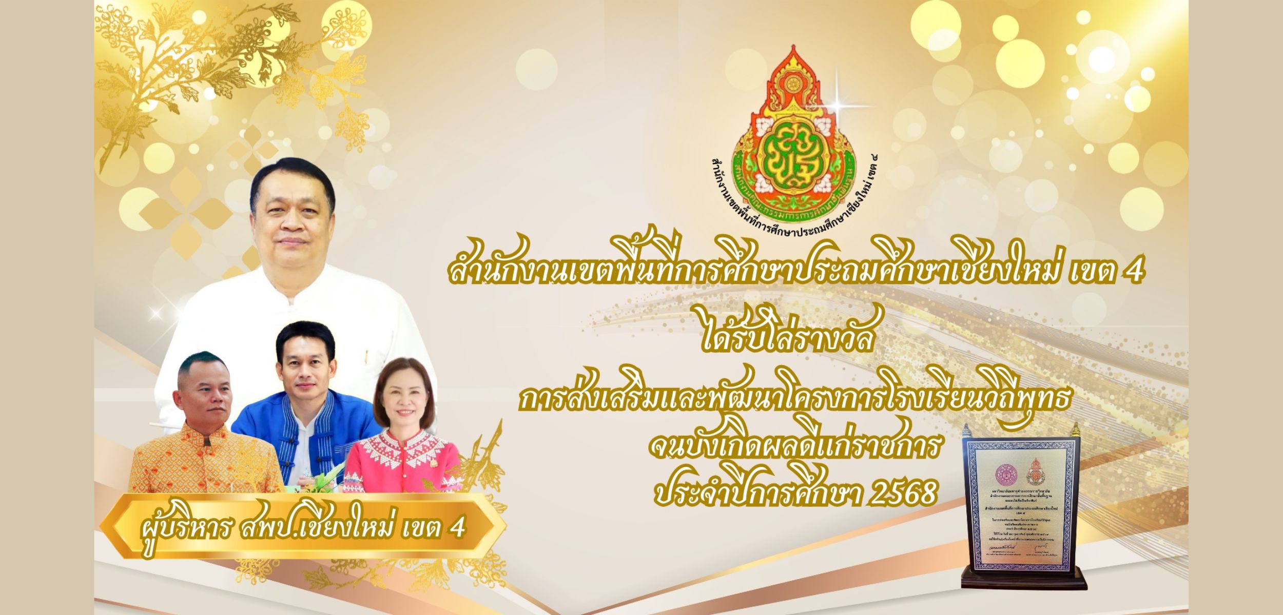 สำนักงานเขตพื้นที่การศึกษาประถมศึกษาเชียงใหม่ เขต 4 ขอแสดงความยินดีกับ โรงเรียนวัดท่าต้นกวาว และโรงเรียนบ้านท้าวบุญเรือง ที่ได้รับโล่รางวัลโรงเรียนต้นแบบสหกรณ์โรงเรียน ระดับประเทศ รุ่นที่ 4 (ห้องแล็บสอนอาชีพ) โครงการสหกรณ์โรงเรียน