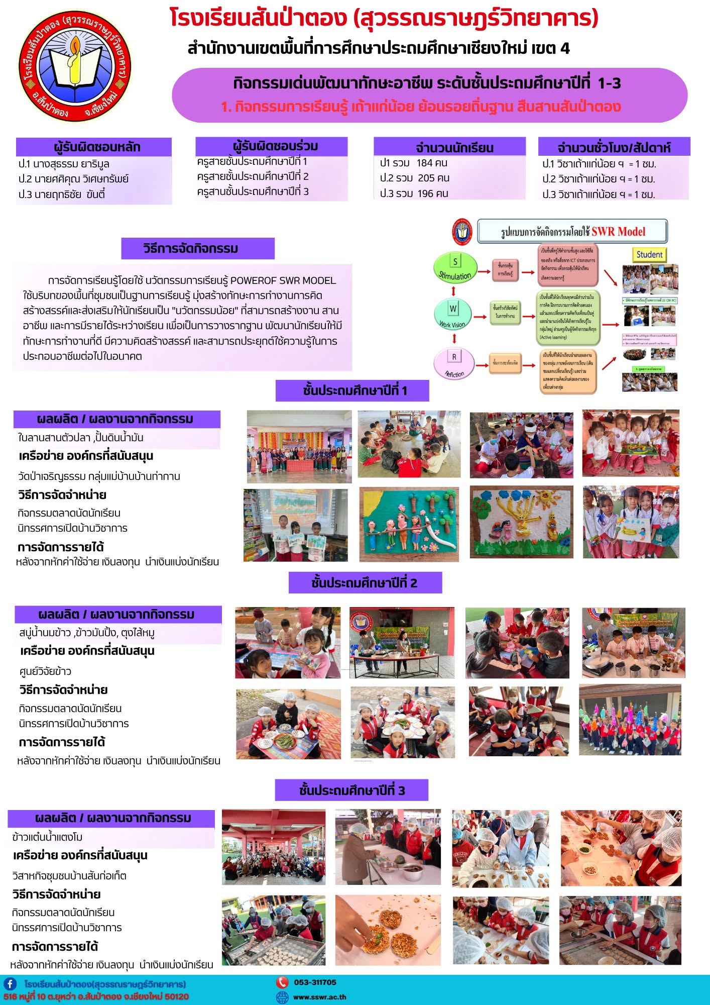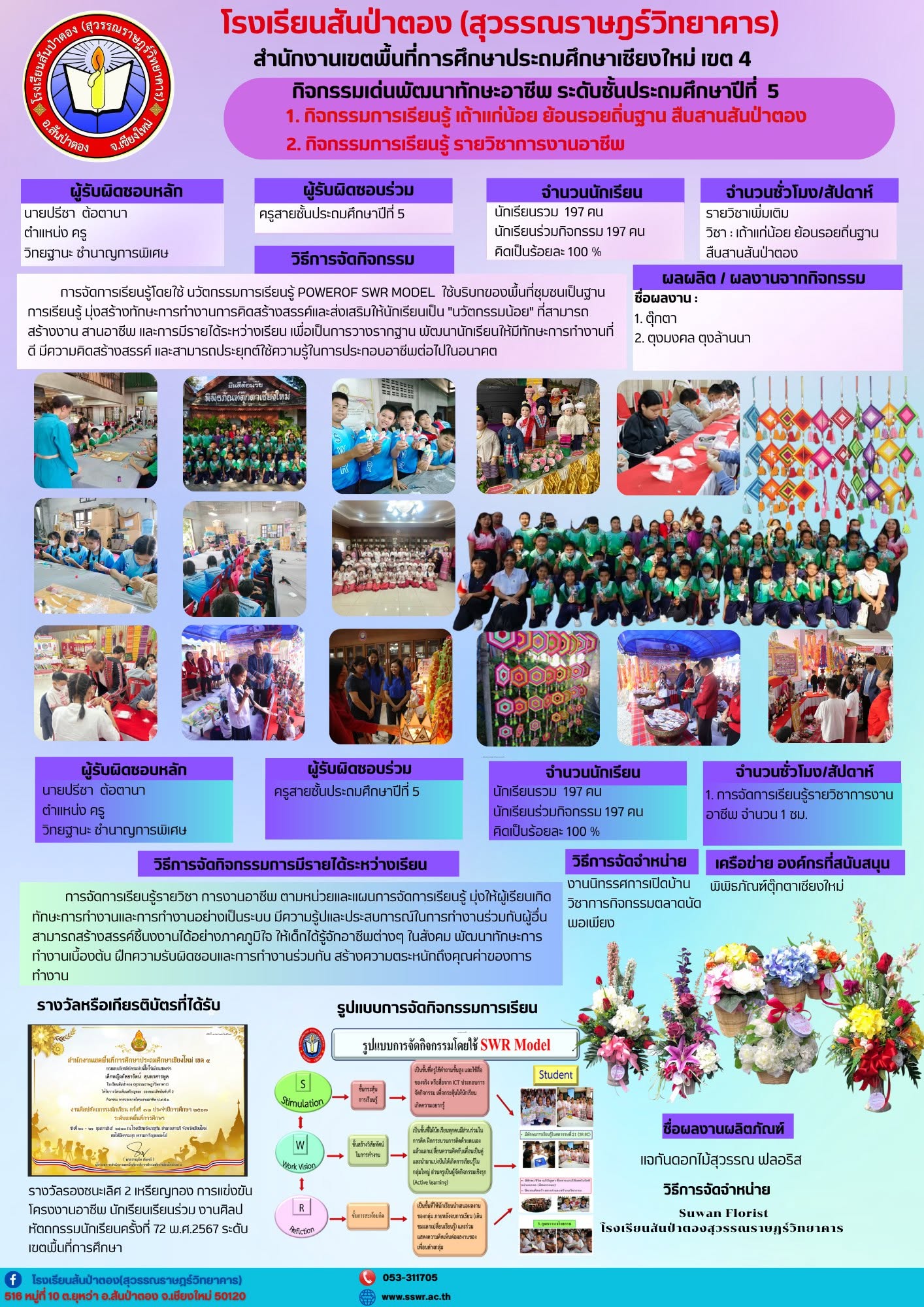 โรงเรียนสันป่าตอง (สุวรรณราษฎร์วิทยาคาร)ได้ผ่านการคัดเลือก เป็นโรงเรียนต้นแบบการจัดกิจกรรมพัฒนาทักษะอาชีพ และการมีรายได้ระหว่างเรียน ระดับดีเด่น ปีงบประมาณ 2568 ของสำนักงานเขตพื้นที่การศึกษาประถมศึกษาเชียงใหม่ เขต 4