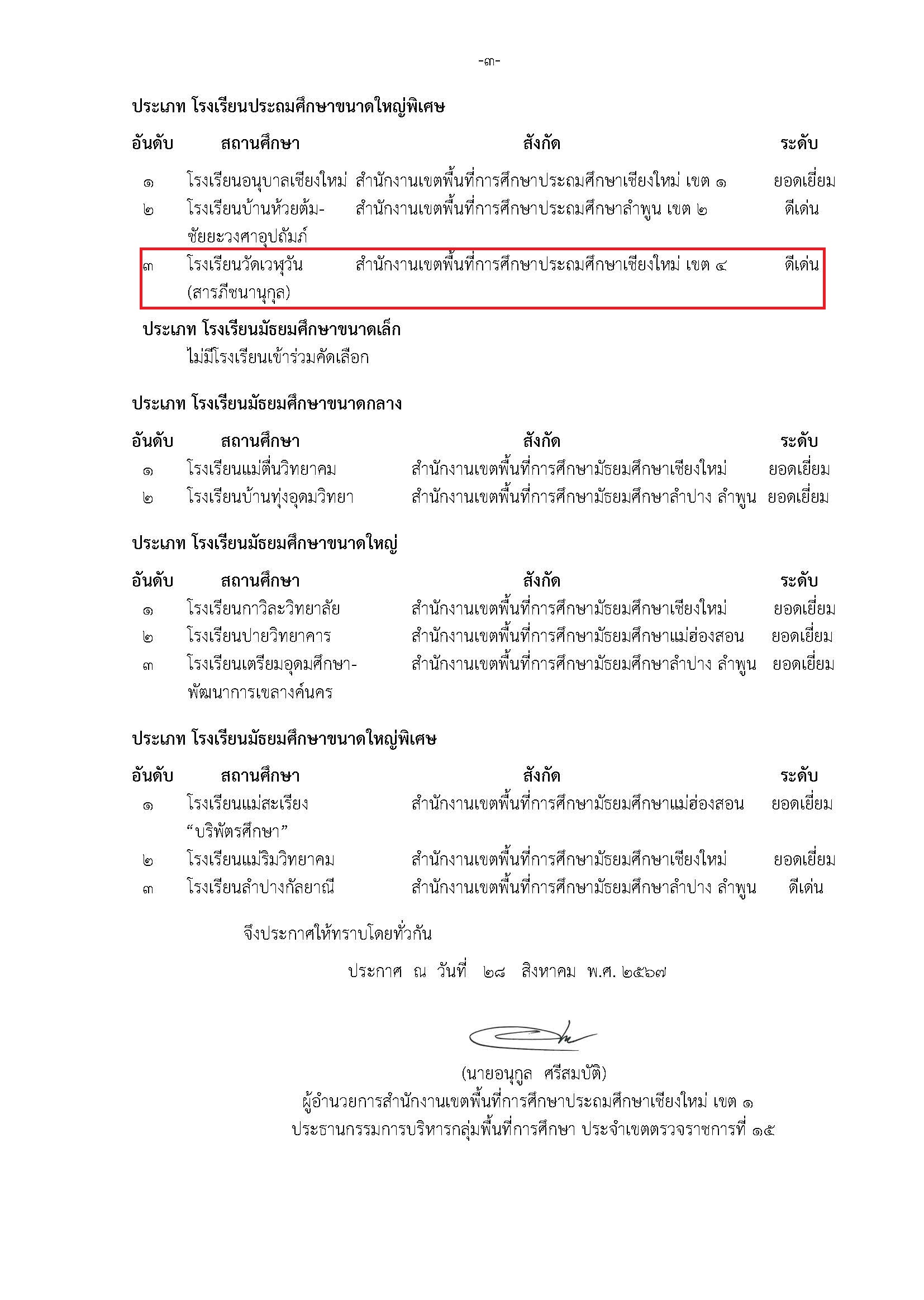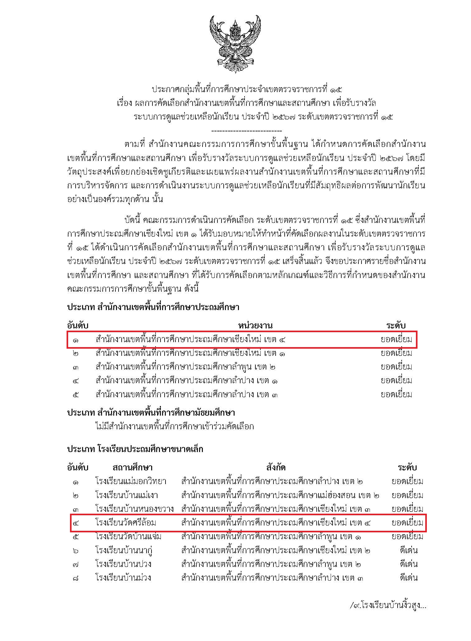 สำนักงานเขตพื้นที่การศึกษาประถมศึกษาเชียงใหม่ เขต 4 ขอแสดงความยินดีกับสถานศึกษาที่ได้รับการคัดเลือก เพื่อรับรางวัลระบบดูแลช่วยเหลือนักเรียน ประจำปี 2567 ระดับเขตตรวจราชการที่ 15 โดยสำนักงานเขตพื้นที่การศึกษาประถมศึกษาเชียงใหม่ เขต 4 ได้รับรางวัลยอดเยี่ยมระดับประเทศ รายละเอียดดังต่อไปนี้