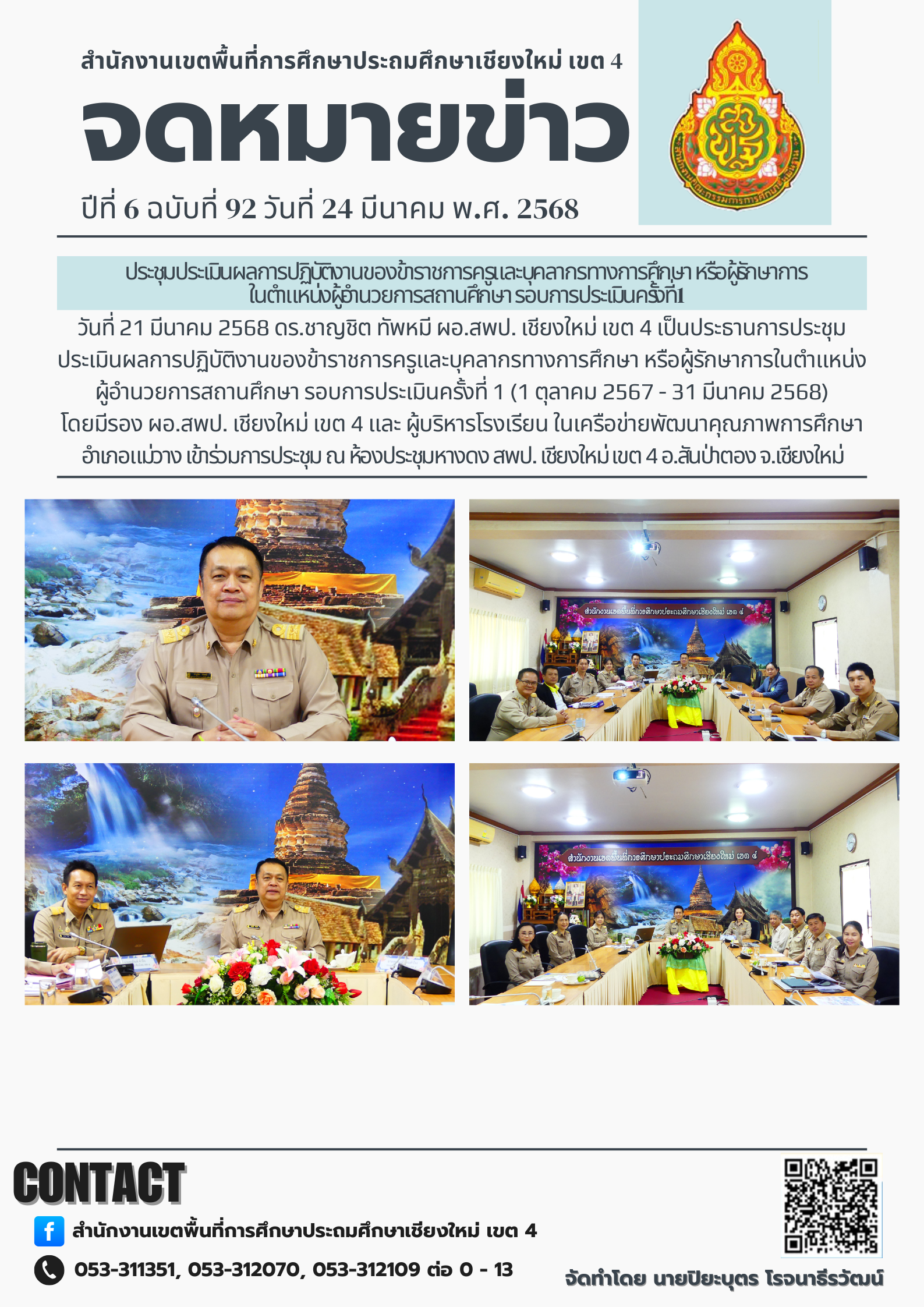วันที่ 21 มีนาคม 2568 ดร.ชาญชิต ทัพหมี ผอ.สพป. เชียงใหม่ เขต 4 เป็นประธานการประชุมประเมินผลการปฏิบัติงานของข้าราชการครูและบุคลากรทางการศึกษา หรือผู้รักษาการในตำแหน่งผู้อำนวยการสถานศึกษา รอบการประเมินครั้งที่ 1 (1 ตุลาคม 2567 - 31 มีนาคม 2568) โดยมีรอง ผอ.สพป. เชียงใหม่ เขต 4 และ ผู้บริหารโรงเรียน ในเครือข่ายพัฒนาคุณภาพการศึกษาอำเภอแม่วาง เข้าร่วมการประชุม ณ ห้องประชุมหางดง สพป. เชียงใหม่ เขต 4 อ.สันป่าตอง จ.เชียงใหม่