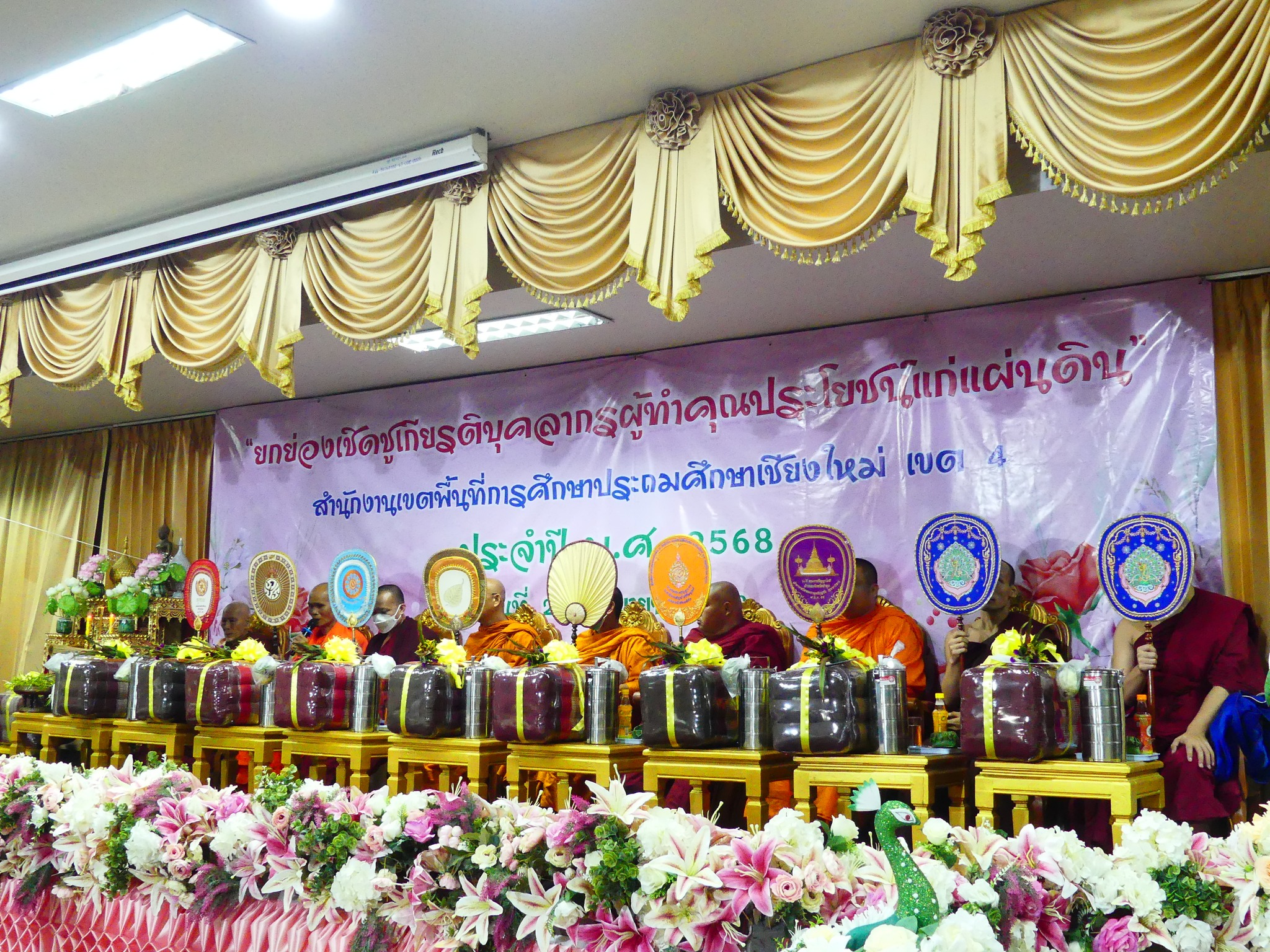 วันที่ 24 กันยายน 2568 สำนักงานเขตพื้นที่การศึกษาประถมศึกษาเชียงใหม่ เขต 4 จัดกิจกรรมโครงการยกย่องเชิดชูเกียรติข้าราชการครูและบุคลากรทางการศึกษา ประจำปี พ.ศ. 2568 โดยมี ดร.ชาญชิต ทัพหมี ผู้อำนวยการสำนักงานเขตพื้นที่การศึกษาประถมศึกษาเชียงใหม่ เขต 4 เป็นประธานเปิดกิจกรรม และมี รองผู้อำนวยการสำนักงานเขตพื้นที่การศึกษาประถมศึกษาเชียงใหม่ เขต 4 ผู้เกษียณอายุราชการ ข้าราชการครูและบุคลากรทางการศึกษา ผู้อำนวยการสถานศึกษา และข้าราชการครูและบุคลากรทางการศึกษาเข้าร่วมกิจกรรม ณ ห้องประชุมสันป่าตอง สพป. เชียงใหม่ เขต 4 อ.สันป่าตอง จ.เชียงใหม่
