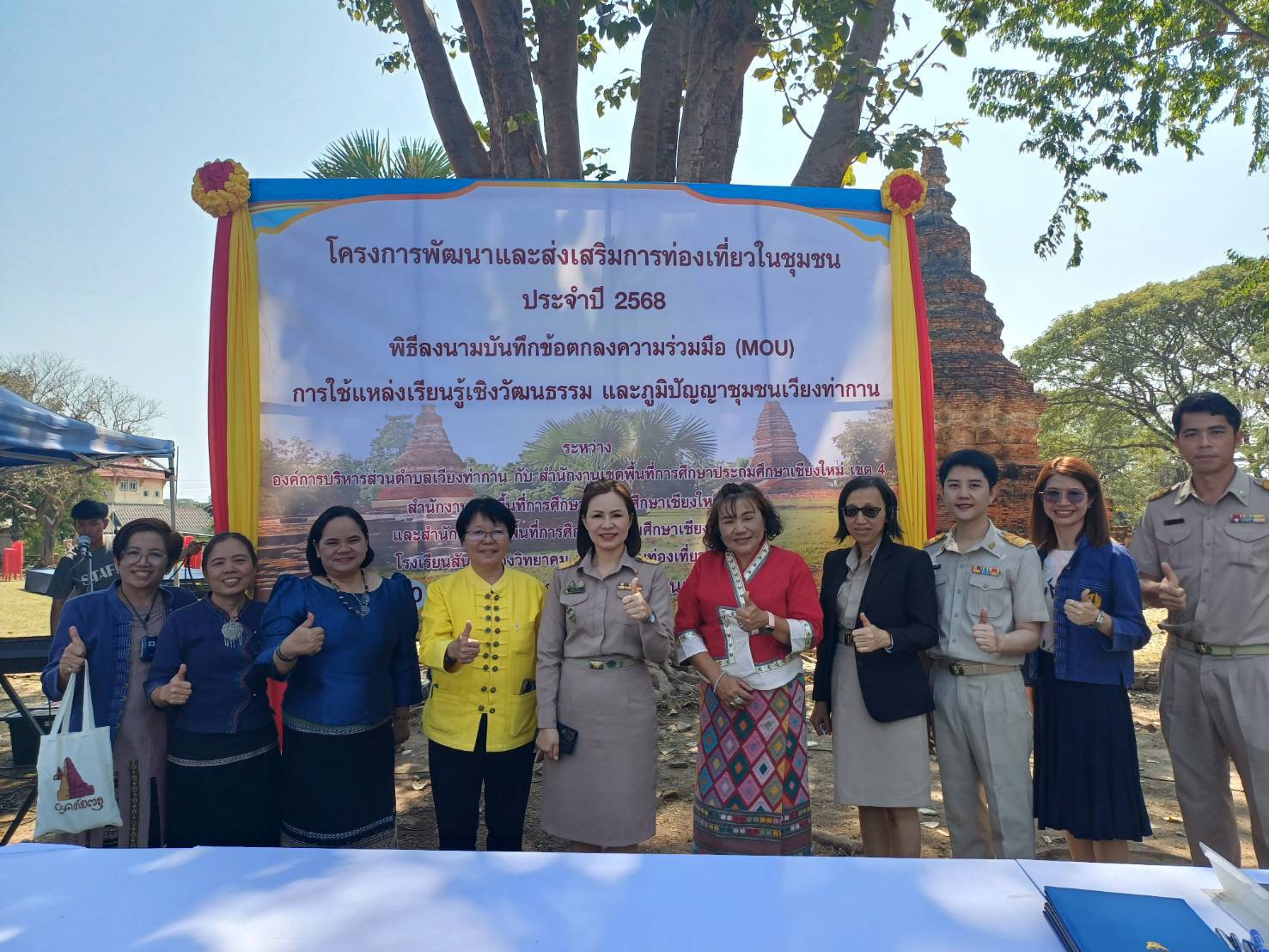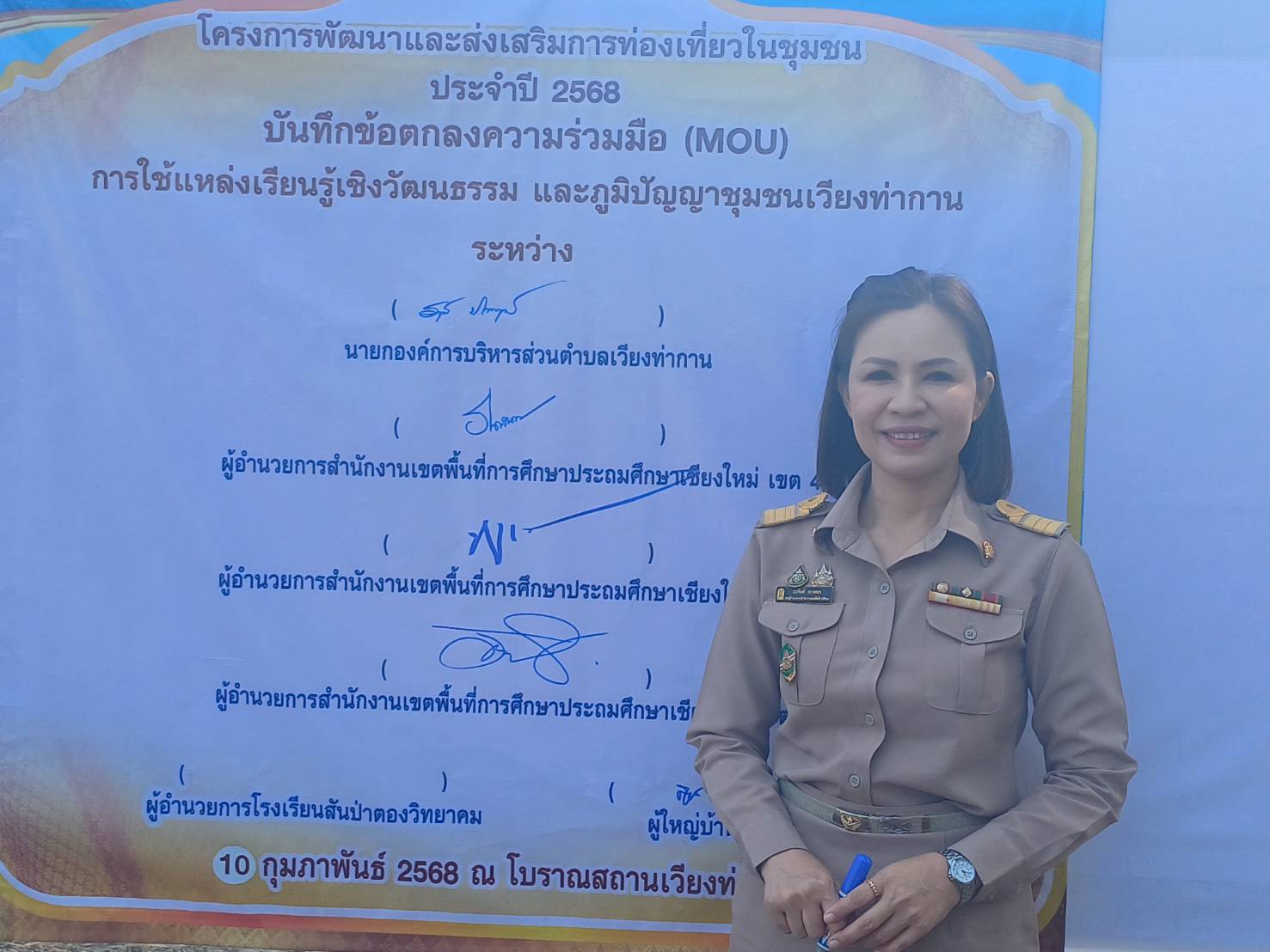 วันที่ 10 กุมภาพันธ์ 2568 ดร.ชาญชิต ทัพหมี ผู้อำนวยการสำนักงานเขตพื้นที่การศึกษาประถมศึกษาเชียงใหม่ เขต 4 มอบหมายให้ ดร.ธนพินท์ พวงทอง รองผู้อำนวยการสำนักงานเขตพื้นที่การศึกษาประถมศึกษาเชียงใหม่ เขต 4 เป็นผู้แทนของสำนักงานเขตพื้นที่การศึกษา ในการร่วมลงนามบันทึกข้อตกลงความร่วมมือ (MOU) การใช้แหล่งเรียนรู้เชิงวัฒนธรรมและภูมิปัญญาชุมชนเวียงท่ากาน ตามโครงการพัฒนาและส่งเสริมการท่องเที่ยวชุมชน โดยมี นางสาวชนกานต์ ทิพย์อุ่น และนางชุติมา กันทวีชัย ศึกษานิเทศก์ เข้าร่วมกิจกรรม ณ โบราณสถานเวียงท่ากาน ตำบลสันกลาง อำเภอสันป่าตอง จังหวัดเชียงใหม่
