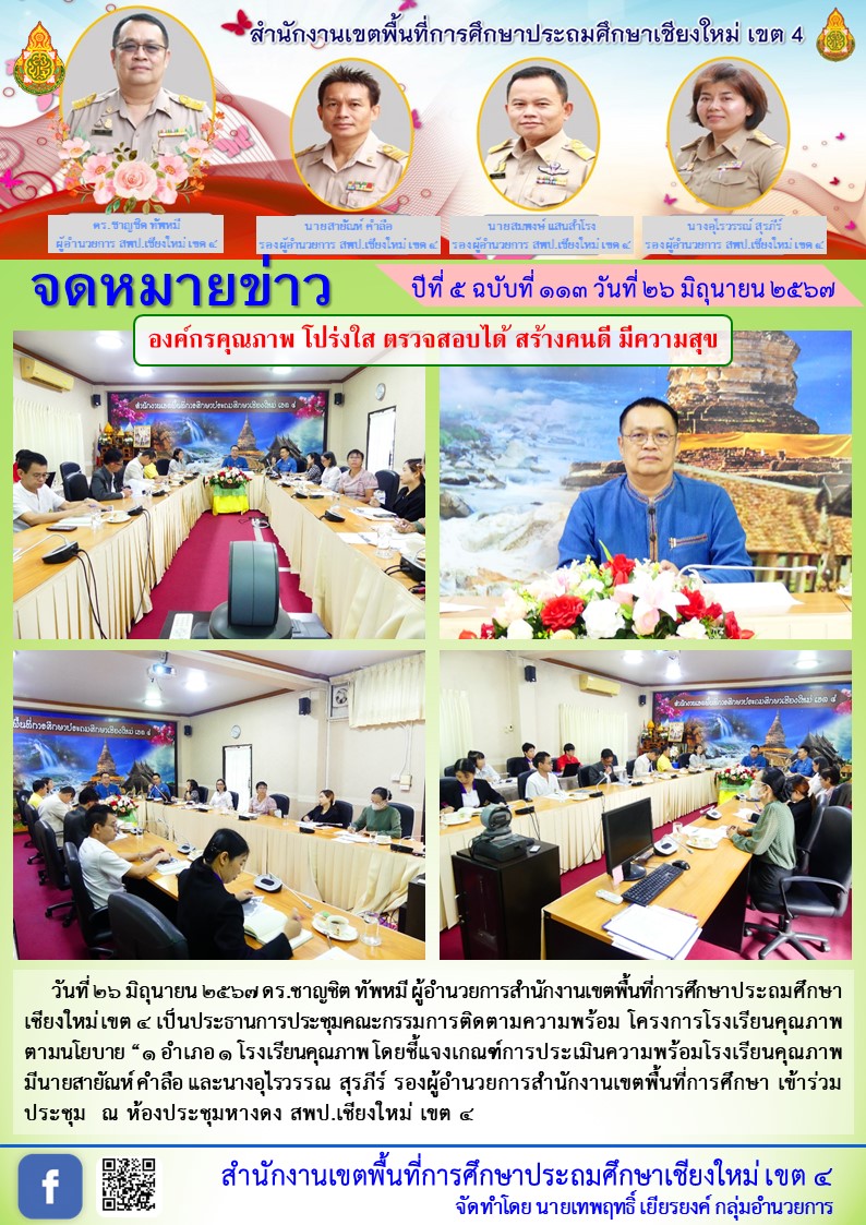 วันที่ 26 มิถุนายน 2567 ดร.ชาญชิต ทัพหมี ผู้อำนวยการสำนักงานเขตพื้นที่การศึกษาประถมศึกษาเชียงใหม่ เขต 4 เป็นประธานการประชุมคณะกรรมการติดตามความพร้อม โครงการโรงเรียนคุณภาพ ตามนโยบาย “1 อำเภอ 1 โรงเรียนคุณภาพ" โดยชี้แจงเกณฑ์การประเมินความพร้อมโรงเรียนคุณภาพ มีนายสายัณห์ คำลือ และนางอุไรวรรณ สุรภีร์ รองผู้อำนวยการสำนักงานเขตพื้นที่การศึกษา เข้าร่วมประชุม ณ ห้องประชุมหางดง สพป.เชียงใหม่ เขต 4