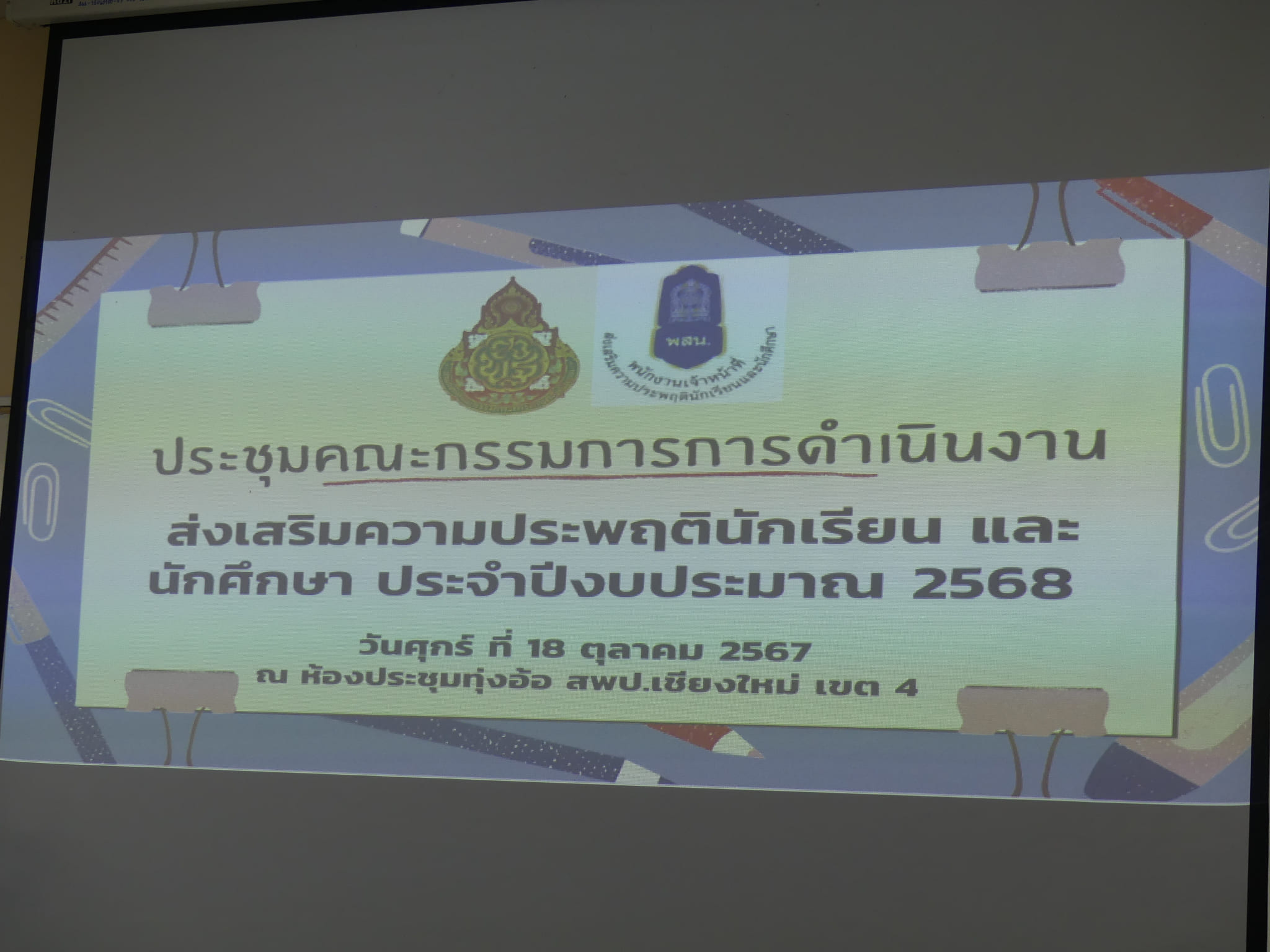 ดร.ชาญชิต ทัพหมี ผู้อำนวยการสำนักงานเขตพื้นที่การศึกษาประถมศึกษาเชียงใหม่ เขต 4 เป็นประธานการประชุมคณะกรรมการการดำเนินงานส่งเสริมความประพฤตินักเรียน และนักศึกษา ประจำปีงบประมาณ 2568