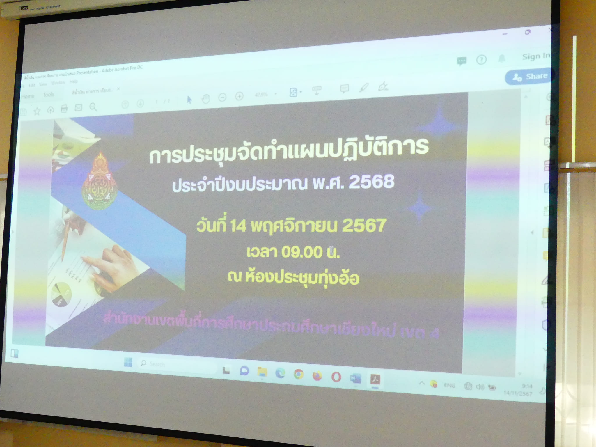 วันที่ 14 พฤศจิกายน 2567 เวลา 09.00 น. ดร.ชาญชิต ทัพหมี ผู้อำนวยการสำนักงานเขตพื้นที่การศึกษาประถมศึกษาเชียงใหม่ เขต 4 เป็นประธานการประชุมคณะกรรมการ การจัดทำแผนปฏิบัติการประจำปีงบประมาณ พ.ศ.2568 เพื่อพิจารณา โครงการ/กิจกรรม/งบประมาณตามแผนปฏิบัติการ ประจำปีงบประมาณ พ.ศ. 2568 ณ ห้องประชุมทุ่งอ้อ สำนักงานเขตพื้นที่การศึกษาประถมศึกษาเชียงใหม่ เขต 4
