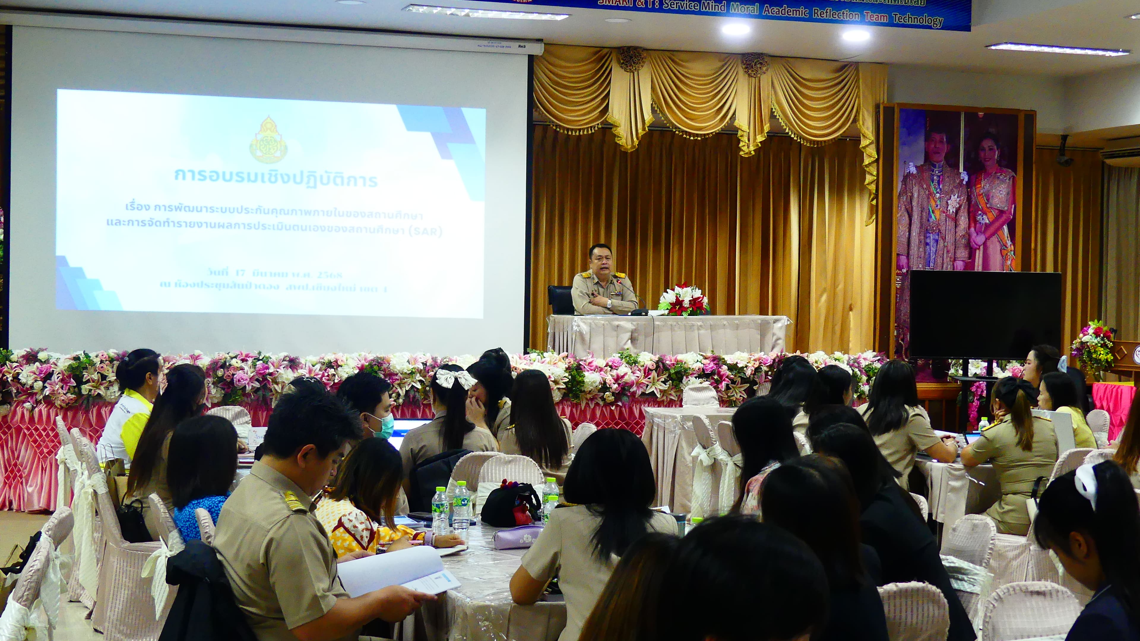 วันที่ 17 มีนาคม 2568 เวลา 9.00 น. ดร.ชาญชิต ทัพหมี ผู้อำนวยการสำนักงานเขตพื้นที่การศึกษาประถมศึกษาเชียงใหม่ เขต 4 เป็นประธานในพิธีเปิดการอบรมเชิงปฏิบัติการ เรื่อง การพัฒนาระบบประกันคุณภาพภายในของสถานศึกษาและการจัดทำรายงานผล การประเมินตนเองของสถานศึกษา (SAR) ณ ห้องประชุมสันป่าตอง สำนักงานเขตพื้นที่การศึกษาประถมศึกษาเชียงใหม่ เขต 4