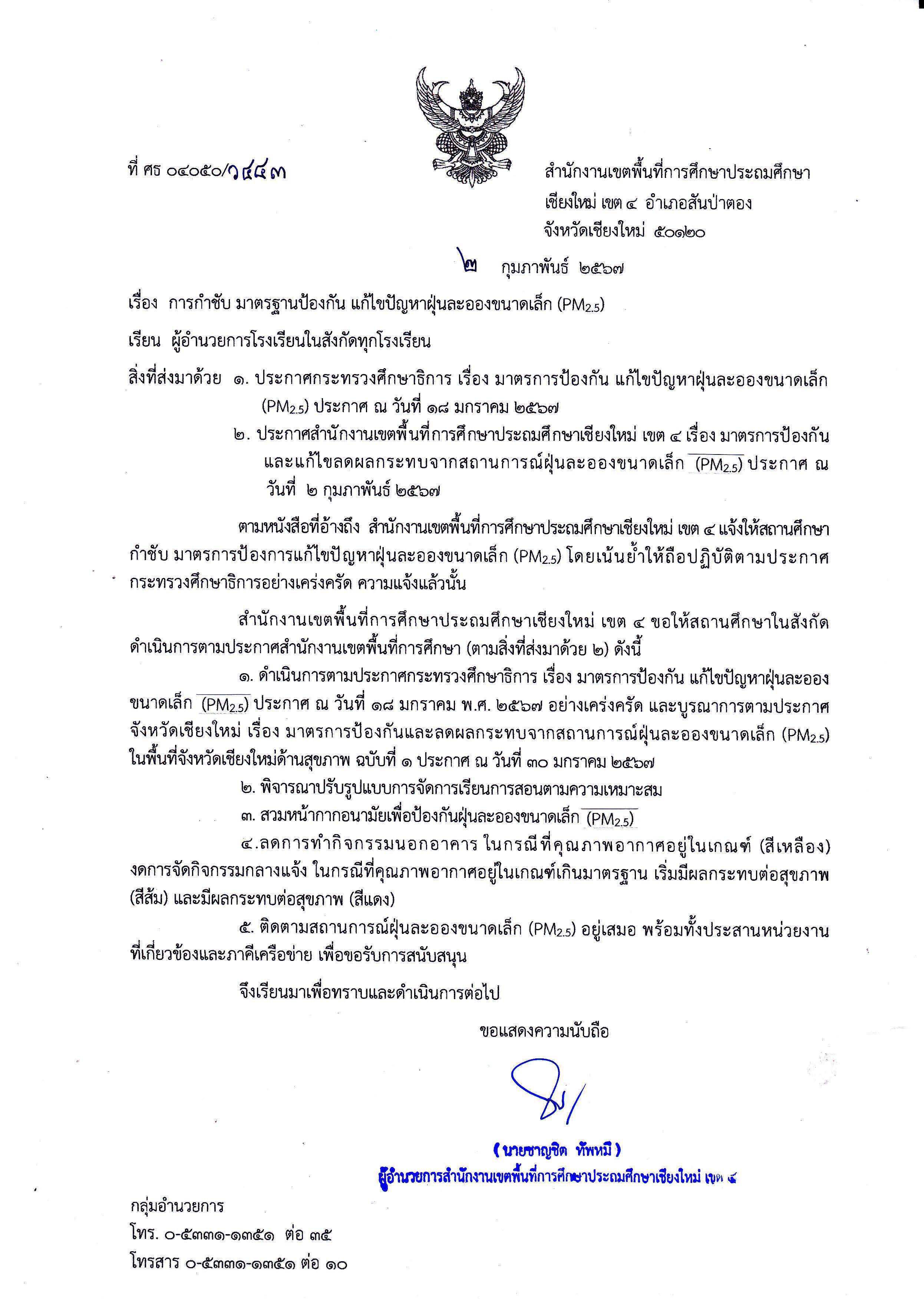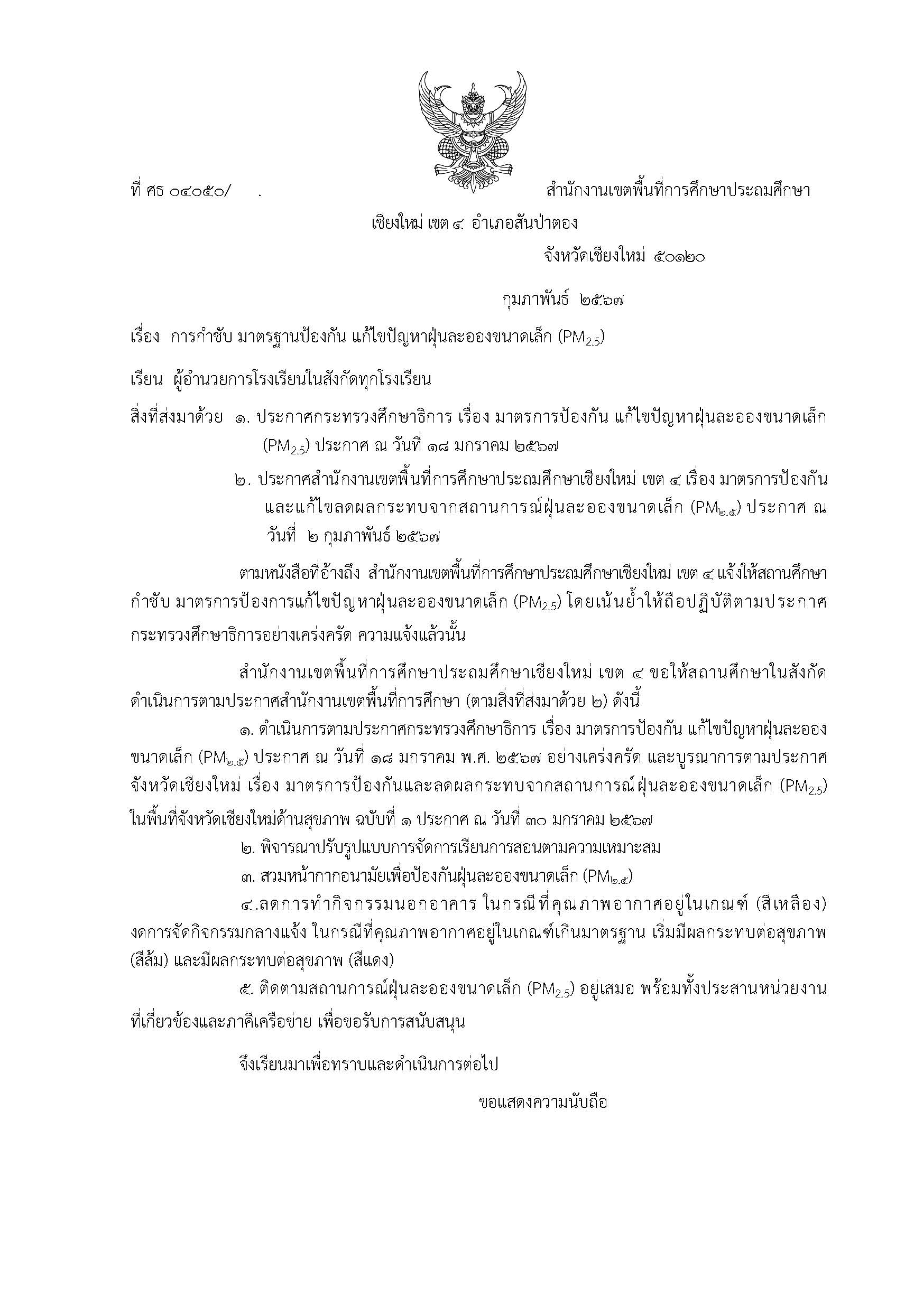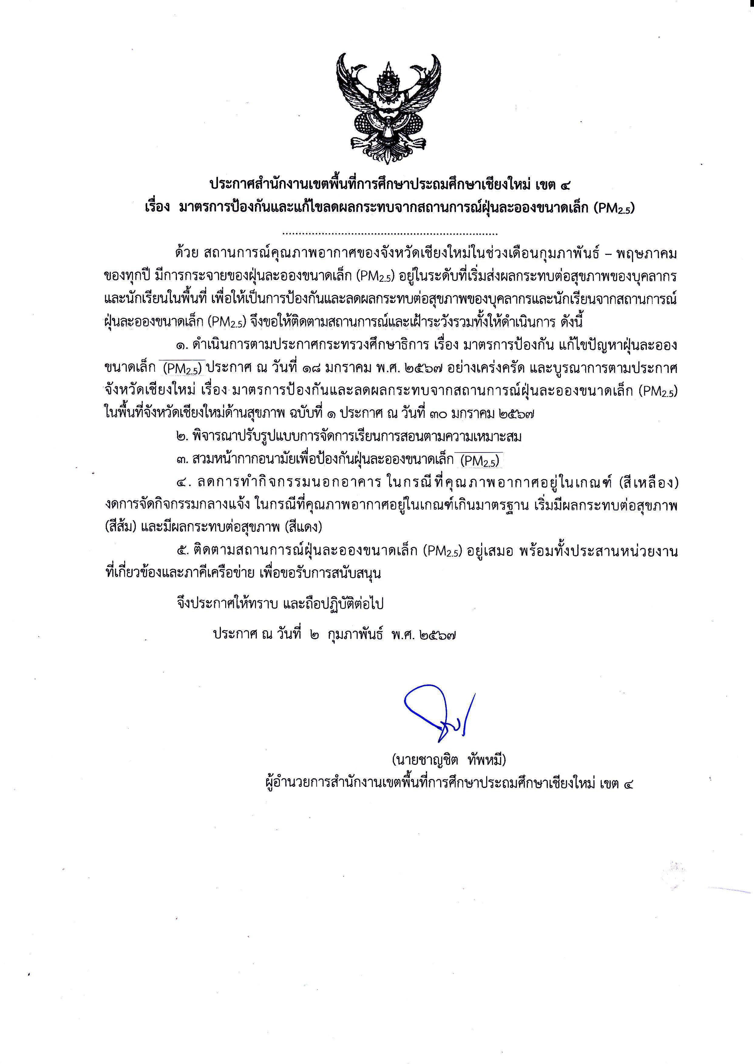 ประกาศสำนักงานเขตพื้นที่การศึกษาประถมศึกษาเชียงใหม่ เขต 4 เรื่อง มาตรการป้องกันและแก้ไขลดผลกระทบจากสถานการณ์ฝุ่นละอองขนาดเล็ก (PM2.5)